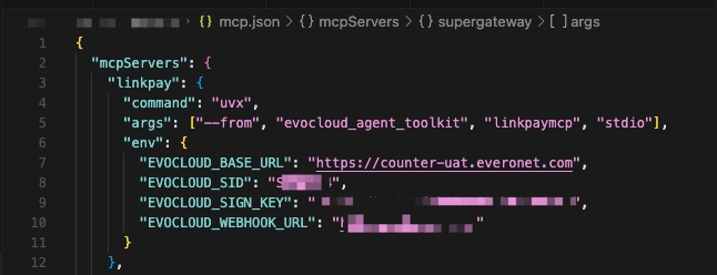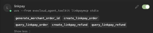 "args": ["--from", "evocloud_agent_toolkit", "linkpaymcp", "stdio"],